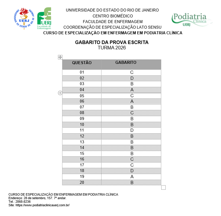 Gabarito da Prova Escrita - Processo Seletivo para Ingresso no Curso de Especialização em Enfermagem em Podiatria Clínica - UERJ
