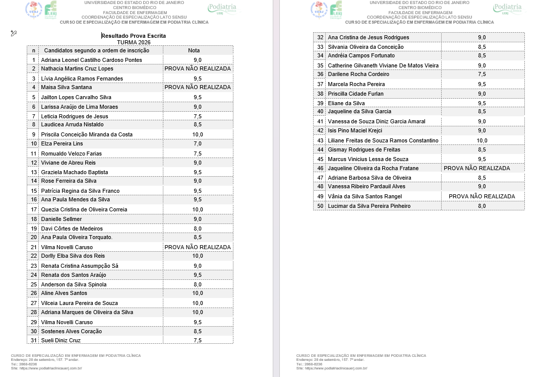 Resultado da Prova Escrita do Processo ao Curso de Especialização em Enfermagem em Podiatria Clínica - UERJ
